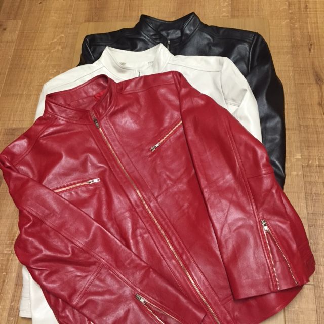 大きいサイズには珍しい、白・赤の革ジャンもあるんです。